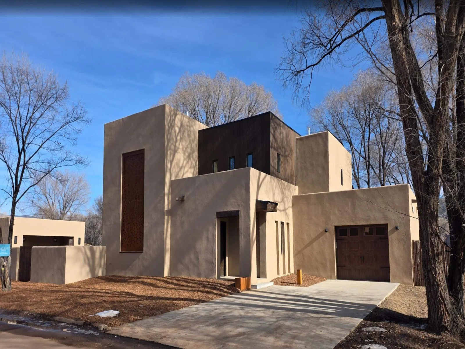 Welcome to ELMhouse, a truly spectacular newly built home surrounded by mature Siberian Elm trees. Located on the quiet Vigil Street you are afforded all the conveniences that town living has to offer. Designed and built by award winning Architect/Interior Designer, Johnna Barrett of Barrett Design, Elm House incorporates bold, dramatic design with the latest in eco-friendly sustainability. As you approach the property, the first thing you notice is the impressive custom designed Corten steel panel which is backlit at night. The lovely foyer, lit with a wall of electric pillar candles and handmade clay tile leads to the open kitchen/ dining/ living area. The kitchen offers Bosch electric appliances and durable, stain resistant quartz countertops with a Summit gas cooktop. A 9-foot Panoramic door opens to the outdoor patio and on to a detached portal which is great for leisurely lunches and dinners and excellent for entertaining. The landscaping offers minimal maintenance with weed barrier, topsoil and mulch. A patch of year-round green is provided by synthetic turf. The spacious dining/living room area has a gas fireplace as well as a mini split unit for additional heat and air conditioning. There are two bedrooms on the first level with a mini split unit in each as well as a full bath. Three storage closets and a large pantry lead to the one-car oversized garage. Enjoy electric radiant floor heat throughout the home. Two tankless on demand water heaters assure that you will never run out of hot water! The walls of the home are breathable lime-washed hand brushed paint which produces a velvety finish. White oak floors throughout the home come with a lifetime warranty. Five handmade wire lamps are suspended from the ceiling, giving a striking effect as you ascend to the second level. The risers of the stairs leading to the second level are enhanced by decorative encaustic tiles. Upstairs you will find the spacious primary bedroom offering a glorious view of Taos Mountain, a gas fireplace and a large ensuite bathroom. The plaster work in the bathrooms is Tadelakt , an elegant traditional waterproof Moroccan lime-based plaster with handmade clay tiles. There is an additional bedroom and a bonus room with a terrace. The bonus room can be used as an office, a TV room, studio, or an additional bedroom. This newly constructed 2488 SF 4-bedroom, 3 bath home which sits on .215 acres with high ceiling and skylights is filled with natural light. The construction is 2×6 and 2×12 which gives the home a very solid feeling. The exterior of the home is finished with Elastomeric stucco, a superior, long lasting, water and crack resistant product. Superior craftsmanship can be seen in every aspect of construction and design. The home is offered fully furnished and decorated in a sophisticated and soothing neutral color scheme giving a buyer the opportunity to add their own personal touches. Bold and dramatic, this stunning eco-friendly home is a must-see and beckons you to call it your own.
