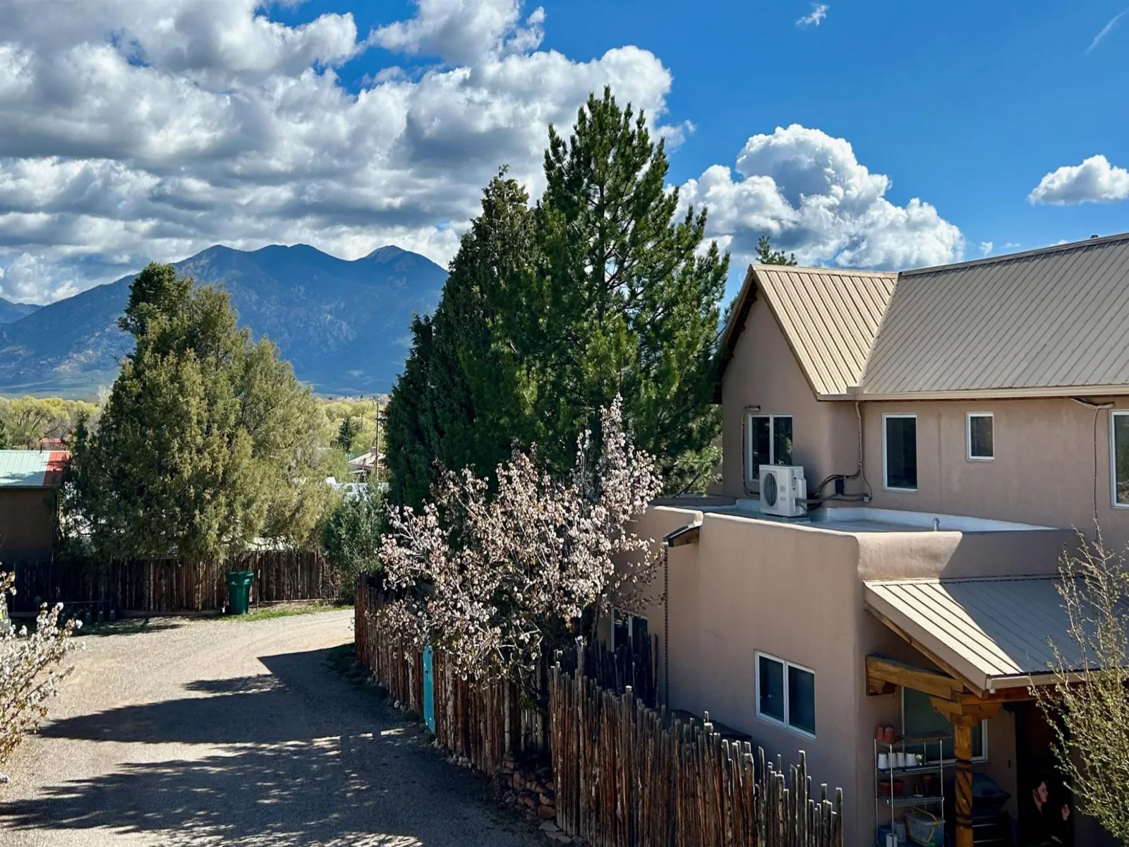Charming, centrally located two-level townhouse, conveniently located to everything that Historic Taos has to offer. You’ll find Toas mountain views from the bedrooms and balcony in this lovingly maintained 3B/3B, 1400+ sqft home, complete with beautiful southwest finishes, Vigas, Kiva gas fireplace, diamond plaster walls and slate tile floors throughout. The kitchen comes furnished with stainless steel appliances, custom cabinets and complimentary granite countertops. A Navien on-demand water heater installed 6 years ago and a new water softener installed last year. Radiant floor heating together with energy efficient Rastra construction which will keep you cool in the summer and warm in the winter. Welcoming patio entrance with flagstone portal and handsome exterior sconces along with expansion pavers to provide a second side-back patio area for watching sunsets. Quiet end unit with high walls for added privacy, offers the perfect combination of comfort and convenience. Located just minutes from everything, this condo offers a great commute for work, shopping, and dining. You’ll be close enough to the iconic Taos Plaza, rich in history and cultural attractions and close to hiking, biking and exploring the stunning New Mexico wilderness. Taos Ski Valley is just a 30 minute drive. Convenient, Comfortable and Cozy Home!